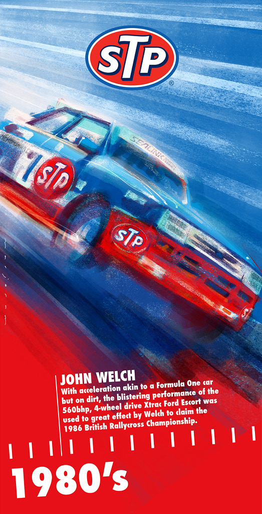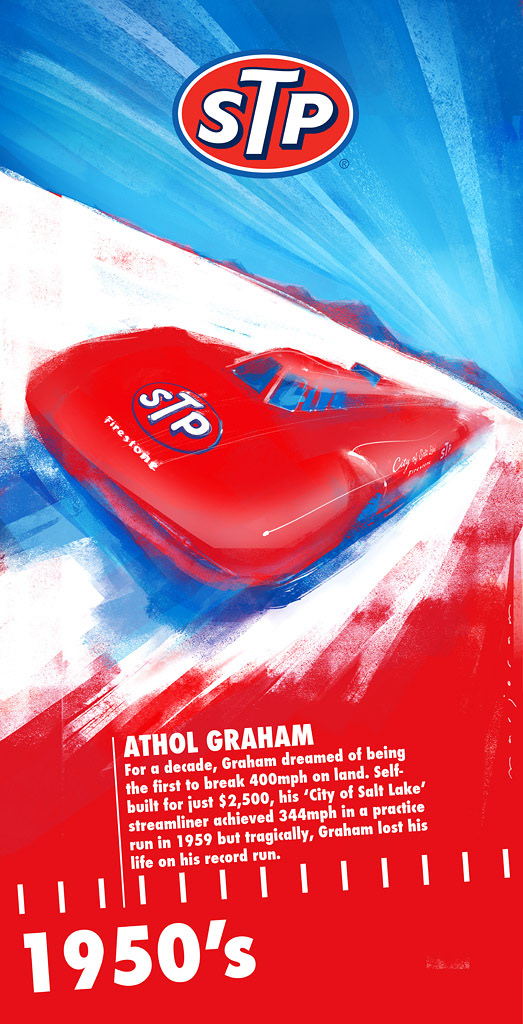In 2014 I was commissioned by STP to mark their 60th Anniversary, celebrating six decades of pioneering motorsport success. These banners formed the stand next to Bloodhound at Autosport International - and were 2 metres high! It was a real treat to see my illustrations on this sort of scale - much bigger than I've ever done before. The seventh illustration (of Bloodhound) was for a limited edition t-shirt, sold at the show. They were painted digitally in Photoshop. They were 'painted' digitally. If there's enough interest I may do a limited run of prints too.